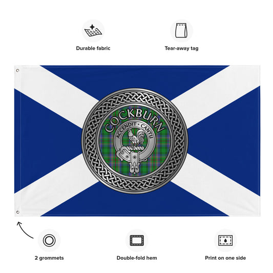 Clan Cockburn Crest & Tartan Knot on Scottish Saltire Flag